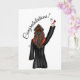 Graduate with brown hair in black cap and gown holding a diploma fashion illustration on a greeting card. Cute card for senior students. Perfect card for female graduates of high schools and colleges. Great card for graduation gifts. Give this special card to your sister, friend, or girlfriend. It demonstrates a big accomplishment.