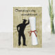 Congratulation graduate card with man graduate silhouette leaning against big diploma. Tan grunge background.
