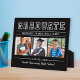 Classic 3 photo graduation plaque display sign with easel features Graduate in bold serif lettering with modern custom text that can be fully customized with the graduate's full name, class year, and school name. Add three favorite pictures of the graduate to the square placeholder images. Black background color can be modified.