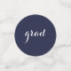 The other side is navy blue, with white text on it. The word "congrats", "graduate" and "grad" are written in a handwriting script. The smallest confetti has white text on navy blue on both sides.