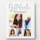 A sleek graduation plaque featuring Graduate in large flowing silver script with the class year, graduate's name, school, and four senior photos on a clean white background. The collage layout showcases one large portrait and three smaller photos for a polished display. Customize with favorite photos and details for a personalized tabletop keepsake or graduation gift.