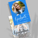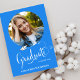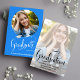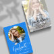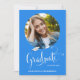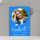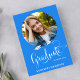 This design features a graduate Blue Announcement, an elegant graduation photo card, with stylish simple elegant script typography, minimalist calligraphy graduation hats, great for trendy high school or college, a classy grad party invitation,2 two photos senior picture, a minimal fancy vellum photo overlay, a class of 2022 2023 2024, a vellum photo transparent overlay, a graduation photo cards