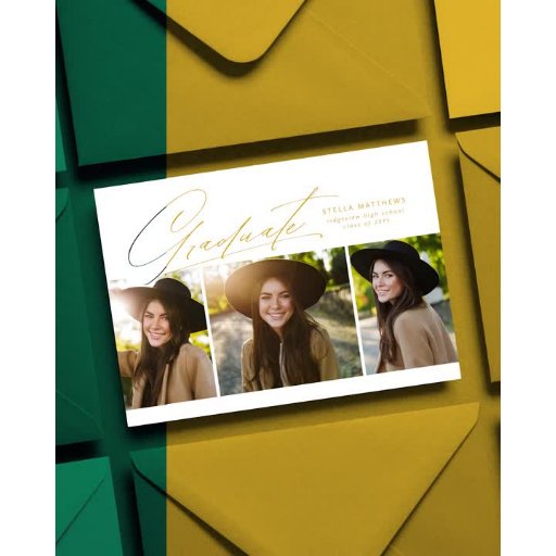 Plain white envelopes are included with paper invitations and will come to fit the invitation size you select. If you don’t need the envelopes, you may choose to not receive them by selecting the dropdown below "Envelopes" and choosing "None." If you’d like to have a design on your envelopes, you can browse all of these available envelopes to find the design that complements your Graduate Three Photo Simple Modern Graduation Invitation.
