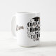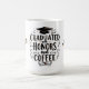 This vibrant and celebratory design features the phrase "Graduated with Honors and Coffee" in bold, playful lettering. The image includes a graduation cap with a tassel at the top, adding a touch of academic achievement. Surrounding the text are whimsical stars and decorative swirls, enhancing the festive feel. At the bottom, a rolled-up diploma tied with a ribbon symbolizes the culmination of hard work and dedication. One side of the mug proudly displays the graduate's name, while the other side marks the year of graduation. This design is perfect for a mug, celebrating the accomplishments of graduates who powered through their studies with the help of coffee.