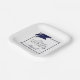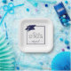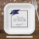 Modern personalized CLASS OF 2025 navy blue, silver and white graduation party plates with your graduate's name in a chic handwritten script with faux metallic navy blue graduation cap and faux metallic silver 2025. ASSISTANCE: For help with design modification/personalization, color change, transferring the design to another product or would like coordinating items, contact the designer BEFORE ORDERING via Zazzle Chat or makeitaboutyoustore@gmail.com.