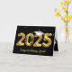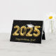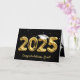 Gold foil balloons for 2025 graduation on a black background with a white cap and gold confetti.