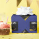 Creative graduation gift wrap or party decoration featuring black and gold graduation cap on blue background. To personalize edit text to add his or her name and the senior class year.