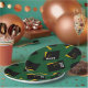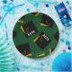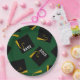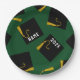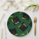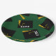 Creative green graduation party plates featuring black and gold graduation caps. To personalize edit text to add name of grad and senior class year.