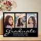 Send your family and friends a unique personalized photo graduation card to wow them. This modern template design features three photos for you to change to your own framed in black. Below your photos is the word "Graduate" in white modern handwritten script typography and your name and details to personalize. The back of the card is black. Designed by artist ©Susan Coffey.