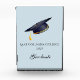 Acrylic award is shown in the block shape and is shown in a blue fog color with a print of a blue graduation cap.