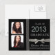 This is a beautiful and exquisite designer grad announcement for classy ladies for out of town family and friends to announce your child's grad without hosting a party. Two photos of your grad student on the left, highlighted with rounded edge square frames in grayscale, satin look ribbon divider strip, bling diamond graphics arranged to form the numbers 2013, and a faux silver metallic glitter looking ribbon wrapping around the black page. Note: all elements are digital, and this is a flat postcard - there is no glitter, ribbon or gems on this product. Sample photo from publicdomainpictures.net cc/cu ok.