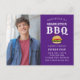 Announce your graduation and invite your guests in style with this custom photo BBQ themed postcard Grad party invitation. This modern design template features a white typography on purple accented by an illustration of a cheese burger with the works. The back of the postcard has your graduation details accented by a white graduation cap. Congrats on your graduation! Designed by artist Susan Coffey.