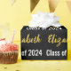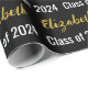 The wrapping paper is black. All of them have a text pattern for the graduate's name and Class of 20xx. The name (Shown: Elizabeth) appears in an elegant faux (not foil) gold script. The other text is white. All of the text can be edited.