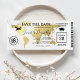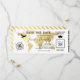 Graduation boarding pass save the date ticket invitation featuring a elegant gold foil destination world map, compass, airplane, graduate cap, and a personalized text template.