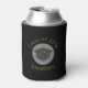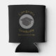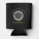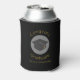 A can cozie which says Class of 20xx and the graduate's name, written in color gold. The back says Congrats graduate with your personalized school name also written in gold color. Designed with a black graduation cap surrounded by a semi-transparent white circle. Black background with gold lettering is simple yet stylish.