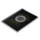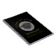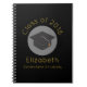 A spiral notebook which says Class of 20xx and the graduate's name and school, written in a gold color. Designed with a black graduation cap surrounded by a semi-transparent white circle. Black background with gold lettering is simple yet stylish.