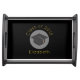 A serving tray which says Class of 20xx and the graduate's name, written in color gold. Designed with a black graduation cap surrounded by a semi-transparent white circle. Black background with gold lettering is simple yet stylish.