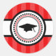 Graduation Caps Stripes Party Favor Sticker (Red / White / Black)...This classic Graduation sticker is the perfect addition to the graduation party invitations inviting friends and family to a graduation party. It's also a great party favor sticker. Use it on goodie favor bags. Put them on toothpicks and put them in graduation cupcakes. Whether you're celebrating a Kindergarten (Kindergarden) Graduation, High School Graduation, Law School (JD) Graduation, Med (Medical / MD) School Graduation, Business School Graduation (MBA), Nursing School (RN) Graduation, Dental School (DDS) Graduation, College Graduation, Pharmacy School Graduation, Veterinary (Veterinarian) School Graduation, or Grad School Graduation (PhD / Masters Degree), this sticker is perfect to mark the occasion. The little graduation cap is too cute. See WindyCityStationery.com for our complete line of "Graduation Cap Stripes" postage stamps and matching "Stripes" invitations and announcements as well as our lines of invitations, save the dates, postage stamps, note cards, and more for every occasion.