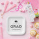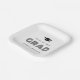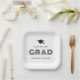 Graduation paper plates featuring a graduate cap and the graduate's name and year above and below the text "grad" in a fun, modern font. Black text on white or custom color background.