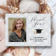 Photo graduation thank you cards. Silver gray color with black text, which makes this design perfect for anyone. Add your portrait photo to the front next to "Thank You" in script. A cap and diploma image separates the remaining text for the grad's name, school, and class. Include a personal message on the back, over a background of graduation caps. Or, delete all wording to hand write each thank you. Also buy this design as an instant download.