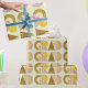 Retro-style graduation gift wrapping paper that features the word "GRAD" designed with geometric shapes in various colors. Retro colors—yellow, pink, brown, and green—add to the retro style.