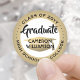 Add an elegant personalized touch to college or high school graduation announcements and invitations with these modern calligraphy round stickers / envelope seals. Design features a gold faux foil graduation cap mortar board, and stylish black typography graduate name, school, and class year. Makes a chic customized addition to graduation party favors and decorations. As an option, change the curved text to a name and address for use as round return address labels on invites or thank you notes.