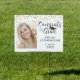 Celebrate your graduate and/or identify the party location or decorate the pathway with this personalized lawn sign featuring one or two photos (one on each side), CONGRATS TO OUR GRAD in chic calligraphy script typography accented with a graduation cap, faux metallic gold foil confetti, their name and school in black on a white background. SIGN OPTIONS: The sample is shown in the 18x24" size--other sizes are available on the ordering page. ASSISTANCE: For help with design modification or personalization, color change, resizing, transferring the design to another product or you would like coordinating items, contact the designer BEFORE ORDERING via the Zazzle Chat MESSAGE tab below or email makeitaboutyoustore@gmail.com.