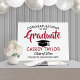 Add a personalized touch to a college or high school graduation celebration with a red, white and black 18"x24" foam board sign. All text is simple to customize. Design features a white background, black mortar board cap, stylish modern typography, and handwritten style script calligraphy. This graduation party sign is an elegant way to celebrate the special day. Congratulations to the graduate!