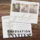 This design features a simple two photo graduation invitation template, with QR code and Facebook URL for website and online event page. a three 3 picture elegant graduate announcement layout, with modern simple calligraphy, trendy script typography, great for high school or college vertical, a graduation grad party invite, a senior student minimal minimalist design, great congratulations celebration, with gold text and white background, and a fancy script font