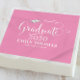 This design features a graduation graduate grad party napkin, with simple elegant calligraphy script, a modern mortarboard mortar board cap, a trendy stylish calligraphy script font, a minimalist minimal simple typography, for a graduation party cocktail paper napkin, a grad party drink bar napkin, a fancy filigree swirly font text, a graduation grad party parties supplies, a hot pink blush color