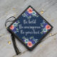 Graduation cap topper with an inspirational quote, "Be bold, be courageous, be your best." on a navy blue background with pretty coral/pink and blue flowers and green leaves. Zazzle's design tools will allow you to change the background color of this cap topper to match your school colors.