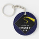 Creative graduation memento keepsake keychain gift featuring black graduation cap and gold tassel on navy blue background. To customize edit text to change senior class year.