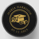 A golden design of a graduation cap and diploma with your graduates name and date around the design.
