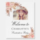 A welcome board for an elegant and modern graduation party. White background, decorated with boho style pampas grass and rose gold and blush pink florals. Personalize and add a photo inside the arch frame, name.