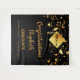 A chic black background. Decorated with dripping golden stars and a modern, abstract faux gold cap, hat, tassel topper with the year inside. Personalize and add a name, school name/year. The text: Congratulations and the name are written with a large modern hand lettered style script. For both him and her. A banner , party decoration, or photo booth, backdrop, Year (any year) graduation party.
