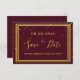 A Save the Date card for a Graduation Party party. A burgundy background decorated with golden confetti and a faux gold frame. Personalize and add a date and name. Golden colored letters. The text: Save the Date is written with a large trendy hand lettered style script.