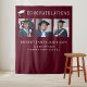 Elegant burgundy red graduation party photo booth backdrop to celebrate the graduate. "Congratulations" is in large white typography with an illustration of a graduation cap. Add three photos of the grad and their name, class year and school name in modern white typography. The background and text colors can be edited to match your school colors by editing in the design tool.