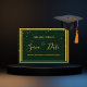 A Save the Date card for a Graduation Party party. Emerald green background decorated with golden confetti and a faux gold frame. Personalize and add a date and name. Golden colored letters. The text: Save the Date is written with a large trendy hand lettered style script.