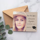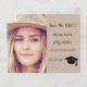 On front: Add your own vertical size photo of the graduate. A chic mocha, beige colored background, black text. Templates for a name and date. The name and the text: Save the Date are written with a modern hand lettered style script. With a cap, tassel topper.