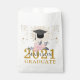 Simple graduation party napkins with floral decorated typography grad cap and gold type on white favor bag for goodies for your guests whether in person or drive by grad party. Simple and minimalist typography and grad cap with gold rays.