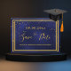 A Save the Date card for a Graduation Party party for a guy, man, male. A navy blue background decorated with golden confetti and a faux gold frame. The blue color is uneven. Personalize and add a date and name. Golden colored letters. The text: Save the Date is written with a large trendy hand lettered style script.