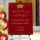 Welcome guests to your graduate's graduation party with this elegant, personalized foam board sign featuring gold star confetti, a gold faux glitter graduation cap and modern handwritten script against an editable red background you can change to a school color or coordinating party theme color. OPTIONS: The sample is shown in a 18x24" size; other sizes are available (choose Custom Size for even borders by changing the height and width proportionately AFTER clicking the UNLOCK icon that looks like a chain link). You can also transfer the design to a poster, banner, tapestry backdrop or other products or have the designer convert it to a digital DOWNLOAD file for printing locally. ASSISTANCE: For help with design modification or personalization, color change, resizing, transferring the design or converting to a Download file, contact the designer BEFORE ORDERING via the Zazzle Chat MESSAGE tab or email makeitaboutyoustore@gmail.com.