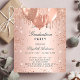 A rose gold faux metallic looking background. Decorated with rose gold, pink faux glitter drips, paint dripping look and balloons. Personalize and add a name and party details. The name is written with a hand lettered style script