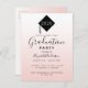 An elegant, simple and girly invitation card for a graduation party. Chic rose gold and white gradient ombre background and a modern black abstract tassel topper in black, with the year inside. Template for name and party details. The text Graduation and the name are written with modern handlettered style script. Black colored text.