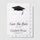 ''Save the Date' for a graduation party with this black and white save the date. You can personalize it with the graduate's name and party date. A graduate's cap is at the top above the text.