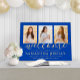 Add a personalized touch to college or high school graduation party decorations with a stylish 3 photo collage 18"x24" foam board welcome sign. The pictures and all wording on this template are simple to customize, and colors are easy to change with the Zazzle design tool. (IMAGE PLACEMENT TIP: An easy way to position a photo is to crop it before uploading to the Zazzle website.) The royal blue and gold design features trendy handwritten script calligraphy, chic modern minimalist typography, and three photos of your choice, such as a senior pictures or images from the commencement ceremony. Please note that gold is printed color, not metallic foil. This large graduation party sign is an elegant way to welcome guests to the celebration. Congratulations to the graduate!