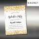 A stylish white background. Decorated with faux gold glitter, sparkles. Personalize and add a name and party details. The name is written with a hand lettered style script