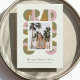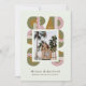 Retro-style, yet modern, graduation announcement photo card that features the word "GRAD" designed with geometric shapes in various colors that form a border around the photo of the graduate. Retro colors—green, pink, brown—add to the card's retro style.