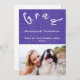 Modern photo graduation announcement with white font against a purple snakeskin print. (This is an artistic design not actual reptile.)