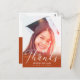 Thank your family and friends for their graduation gifts and well wishes with this elegant custom photo postcard. This chic design template features your photo with a burnt orange overlay at the bottom and a modern hand lettered white script which reads "Thanks" and your name, and class/year below. The back of the card has a thank you note and signature for your to personalize an a green background. Congratulations on your graduation! Designed by artist Susan Coffey.